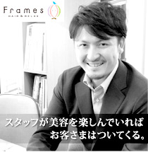 フレイムスでは、一人ひとりの美容師の働き方を尊重することが大切だと、考えています。入社時にみんなの希望を聞いて、どうしたら実現できるのかを一緒に考えていきます。自分がやりたい仕事に取り組むことができれば、モチベーションは上がり、サービスの質も向上、お客さまが増えて会社が伸びていきます。自分の頭で考えて顧客満足を追求する美容師集団になっていきます。フレイムスは、店舗を拡大し、人の循環を作り、役職を増やし、新人を受け入れる余裕が生まれるという、一人ひとりの希望を叶える受け皿を作り続けます。美容師一人ひとりの仕事環境を実現する柔軟性と、大型店のスケールメリットをあわせ持ち、スタッフの幸せを現実化させる会社であり続け、未来を切り開いていきたいと思っています。